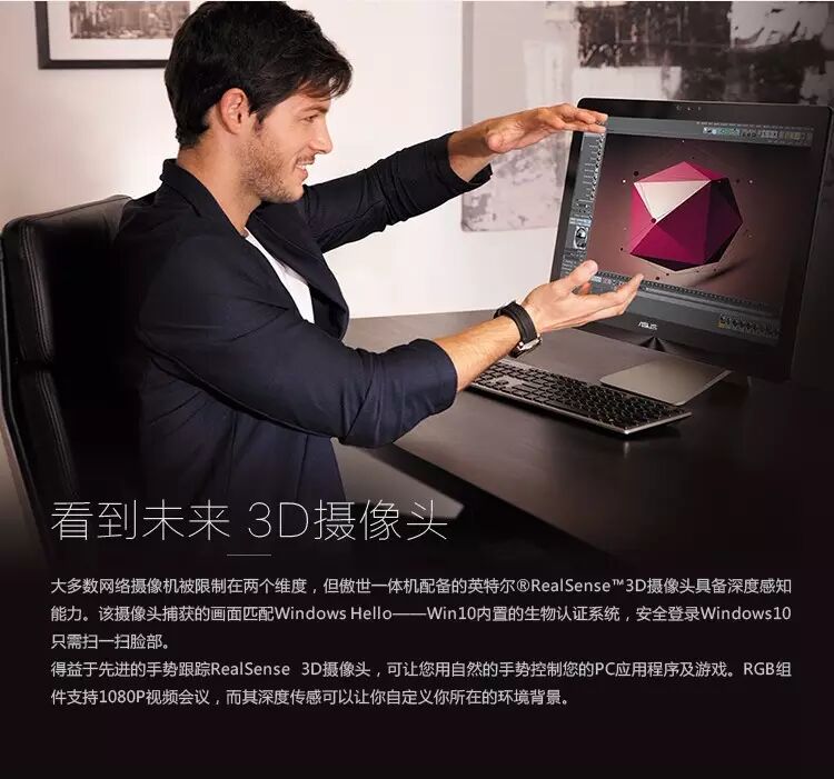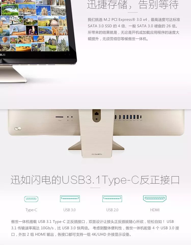 无论是阅读文字、浏览照片或观赏影片,震撼的 4K/UHD 显示屏都能为您献上视觉盛宴。非凡的画质使所有细节都细致晶亮,让您编辑相片或影片时也更加得心应手,就连网页上微小的文字都能一览无遗。 FHD 支持 4K/UHD Zen AiO Pro 的显示屏拥有超广色域,高达 82% NTSC、85% Adobe RGB 和 100% sRGB, Zen AiO Pro 超越一般显示屏,能重现更完整、准确、丰富且生动色彩的原因,绝非几个技术性词汇所能道尽。 Zen AiO Pro 的卓越性能与其精美外形相称,并且毫无逊色。配备英特尔® 酷睿™ i7 处理器和 DDR4 内存,搭载疾速 M.2 PCIe® Gen3 x4 SSD存储设备,让你的精力能完全放在创作上,而非等待运算上。NVIDIA® GeForce® GTX™ 960M 游戏级显卡、丰富I/O端口连接等元素,打造叹为观止的流畅体验,灵感来的快,Zen AiO Pro的速度比灵感更块,让想象到创作一气呵成。 邀您亲临听觉盛宴 Zen AiO Pro 搭载 ASUS Sonic Master Premium 美声大师技术,超越一般音效表现,给您与众不同的声效体验。 ASUS SonicMaster Premium 美声大师技术由华硕金耳朵工程团队精心研发,6个立体声扬声器和 16W 音效输出,打造磅礡低音与清亮高音,给您身历其境、环绕、多层次的美声享受。 拥有 Zen AiO Pro,宛如置身音乐会现场! Zen AiO Pro 搭载充满未来感的 Intel® RealSense™ 3D摄像头。高准确度的 3D 脸部辨识配合 Windows Hello 功能,安全登录Windows10只需扫一扫脸部;双数字矩阵麦克风搭配微软Cortana语音智能助理,,提供准确的声音辨识功能,可轻松添加语音指令操作电脑。解放双手,Zen AiO Pro带你进入全新的交互时代。 Zen AiO Pro 是数字生活的中枢,让您建立专属云端空间,并快速、安全、便捷存取任何设备上的文件。无论您将文件存放于 Zen AiO Pro、移动设备或云端空间中,您都可以使用 Zen AiO Pro 轻松获取。每台 Zen AiO Pro 均附赠一年免费 100GB ASUS WebStorage网络存储空间。 将 Windows 10 全新功能发挥得淋漓尽致,3D Intel® RealSense™ 摄像头搭配 Windows Hello 未来生物识别登录功能;双数字矩阵麦克风除了提升除噪效果,更能让您善用专属的个人语音数字助理 Cortana。 如果需要具备充裕处理能力的 4K 显示屏,又想要类似 Apple iMac 的设计,但又不想放弃 Windows,Asus Zen AiO Pro Z240IC 一体电脑无疑是上佳选择。根据我们的比较结果,Zen AiO Pro 的存储空间比 iMac 大,速度方面也略胜一筹。对于视觉艺术家或多媒体内容创作者而言,两者都是好选择。因此,我们的一体电脑编辑推荐殊荣就由 Asus Zen AiO Pro 与 Apple iMac 27 英寸共同获得。 购买地址:http://item.jd.com/2209650.html 新机开箱:商务办公、娱乐、处理图文视频,都靠它了!色彩更加丰富、准确
